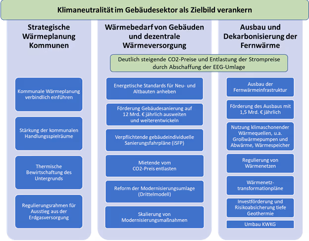 Die Wärmewende erfordert darüber hinaus eine koordinierte strategische Planung, deren Schwerpunkt in den Kommunen liegen muss. Die netzgestützte Wärmeversorgung muss deutlich ausgebaut und auf klimaneutrale Wärmequellen umgestellt werden. Nur so kann der Ausbau der Infrastruktur für die Elektrifizierung der Wärmeversorgung strategisch gesteuert und auch der unvermeidliche Ausstieg aus der Gasnetzinfrastruktur so geplant werden, dass Fehlinvestitionen vermieden werden.